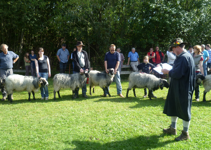 Nach Ankunft der Jungböcke auf der Festwiese und einem kräftigen Schluck Wasser aus der Tränke begann die Körung, das heißt die Prüfung und Bewertung auf Zuchttauglichkeit. Merkmale, wie Klauenabrieb, Wollqualität und Körperbau wurden von einer Fachjury genau unter die Lupe genommen. Den Abschluss des Festes bildete die Versteigerung der Zuchtböcke. Mehr als die Hälfte der Tiere konnte versteigert werden. Die Höhe der Gebote stimmte die Züchter am Ende der Veranstaltung sehr zufrieden.