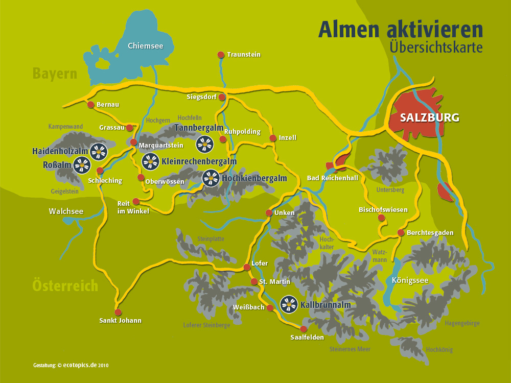 Vier der Almen liegen in Bayern, in den Chiemgauer Alpen.